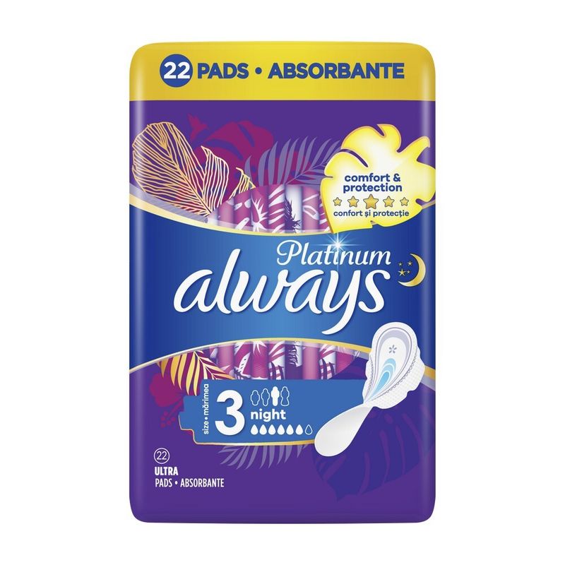 Always Platinum Night (Marimea 3) cu aripioare este recomandat pentru utilizarea pe timpul noptii sau daca aveti un flux mediu sau abundent. Incercati Always Platinum Secure Night (Marimea 4), cele mai bune absorbante igienice Always Platinum pentru protectie pe timpul noptii.