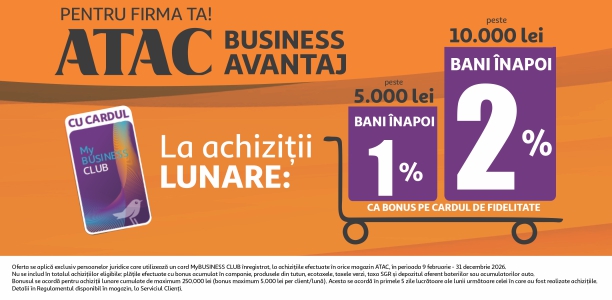 Mai mult, mai avantajos - Cashback lunar, exclusiv pentru afacerea ta, acum tot anul, până pe 31 decembrie 2026. Îți oferim și mai multă valoare pentru achizițiile din magazinele ATAC.