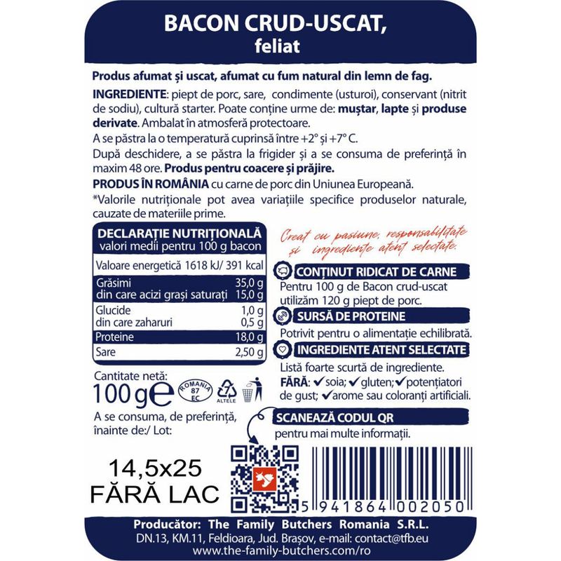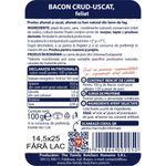 Delicios, ideal a fi utilizat in diverse combinatii de gustari, preparate calde sau aperitive menite sa-i impresioneze pe ce dragi. 100g de Bacon crud-uscat se obtin din 120g piept de porc.