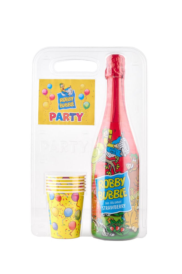 Bauturi si TutunVin si SampanieSampanie copiiBautura carbogazoasa cu aroma de capsuni Robby Bubble Party, 0.75 l + 6 pahare