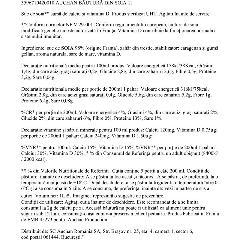 Bautura din soia Auchan, 1 l Bautura din soia Auchan, 1 l
