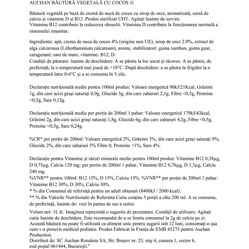 Fie ca urmezi o dieta vegana, vegetariana sau vrei sa inlocuiesti laptele cu un produs usor de digerat, in oferta Auchan gasesti exact ce-ti trebuie. Alege o bautura vegetala Auchan cu gust de cocos, 1 l si savureaza o portie delicioasa de cereale la micul dejun. Aceasta bautura este imbogatita cu vitamina B12 pentru ca tu sa te bucuri de un plus de energie. Iubesti shake-urile si smoothie-urile? Foloseste bautura vegetala Auchan cu gust de cocos, 1 l si pregateste-ti bauturi satioase si pline de savoare. Adauga fructe proaspete sau congelate, pudra proteica sau legume pentru a obtine cel mai bun smoothie. Dupa deschidere: a se pastra la frigider la o temperatura intre 0-6°C si a se consuma in 5 zile.
