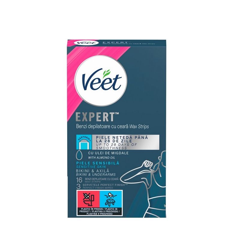 Benzi depilatoare cu ceara Veet, pentru linia bikinilor si axile, 16 bucati. Cu ulei de migdale.