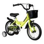 Bicicleta pentru copii Versus 14inch negru-galben. Bicicleta este echipata cu roti ajutatoare pentru siguranta si cosulet frontal. Bicicleta are cadru rezistent din otel, jante de aluminiu, sistem de franare V-Brake, anvelope Rubena, aparatori fata-spate si mansoane aderente pe ghidon. Recomandat pentru varsta de 3-5 ani.