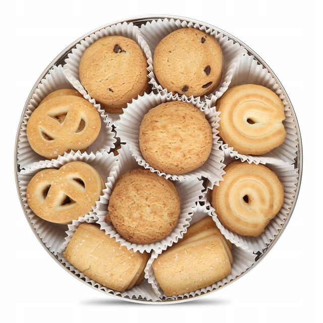 Biscuiti cu unt cu diverse toppinguri: fulgi de ciocolata, zahar, cocos, in cutie metalica.