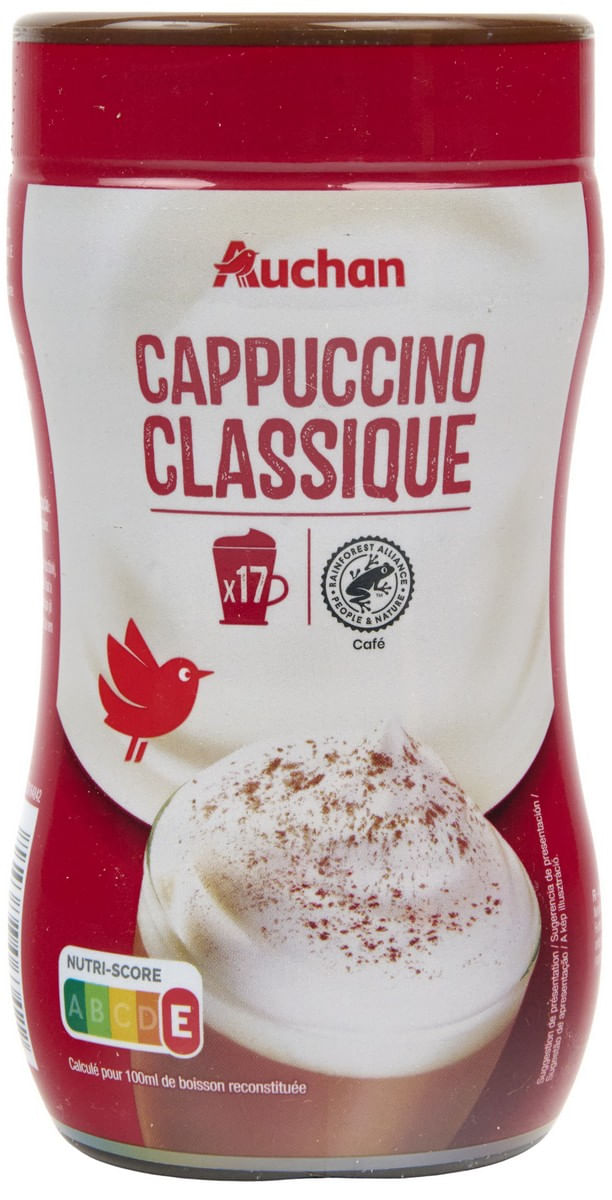 Bautura solubila Auchan Cappuccino, 250 g, pe baza de lapte si cafea, ideala pentru o bautura cremoasa si aromata acasa. Mod de preparare: Turnati 4 lingurite (14 g) intr-o cana mare, adaugati 150 ml de apa clocotita si amestecati usor.