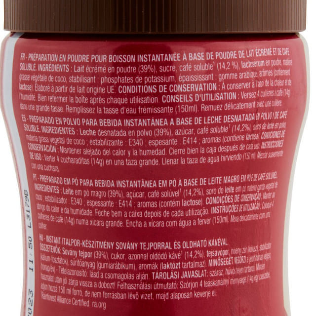 Lap­te degresat pudra (39%), zahar, cafea solubila¹ (14,2%), zer pudra, grasime vegetala de cocos, stabilizator: fosfati de potasiu, agent de ingrosare: guma arabica; arome (contin lactoza). Produs din lapte de origine UE. ¹Certificat Rainforest Alliance. ra.org