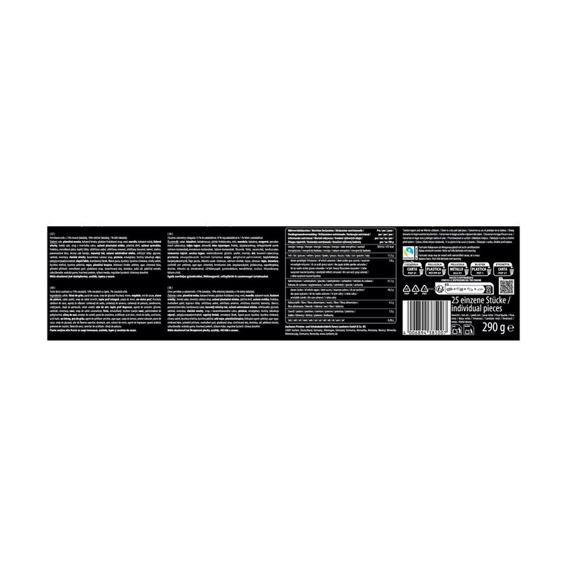 Zahar, faina de grau, masa de cacao, sirop de glucoza-fructoza, miere, migdale, unt de cacao, alune de padure, zahar brun, sirop de zahar invertit, lapte praf integral, pulpa de mere, zer praf dulce (lapte), fructoza, samburi de caise, agenti de crestere: carbonati de sodiu, carbonati de amoniu, carbonati de potasiu; condimente, scortisoara, coaja de portocala, zahar candel, grasime pura din unt (lapte), lapte praf degresat, umectanti: glicerina, sorbitol, invertaza; nuci, sirop de zahar caramel, fistic, emulgatori: lecitina (contine soia), poliglicerol poliricinoleat; albus de ou, amidon de cartofi, pasta de smochine, acizi: acid citric, citrati de sodiu, acid lactic, acid malic; ou intreg, gris de grau, agenti de gelifiere: pectina, agar; coaja de lamaie, arome naturale, piure de caise, sirop de glucoza, ulei de floarea-soarelui, dextroza, sare, extract de mar, agent de ingrosare: guma arabica; proteina din mazare, faina de orez, regulator de aciditate: citrati de potasiu.