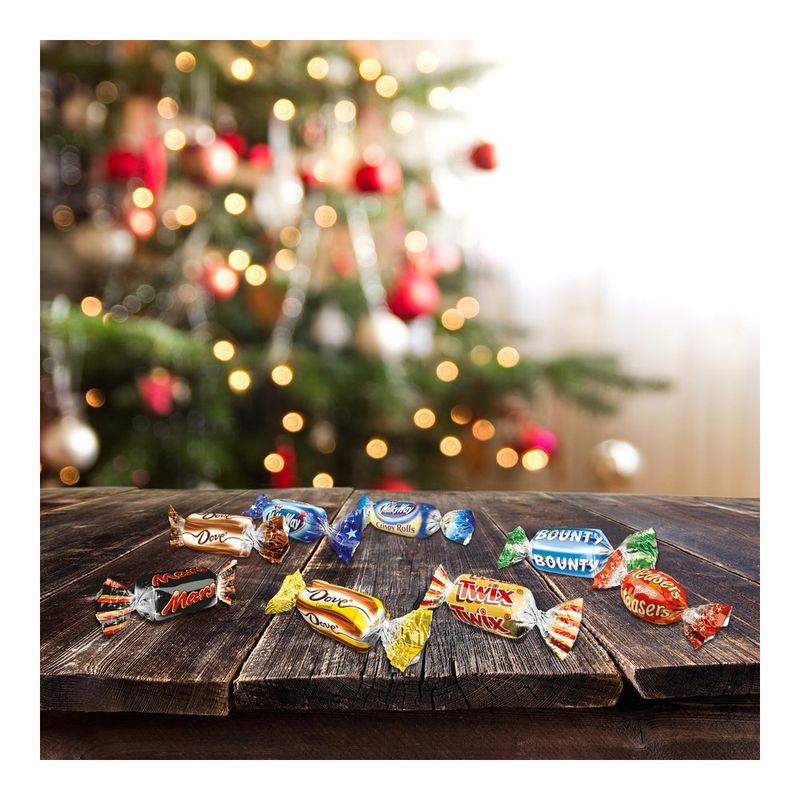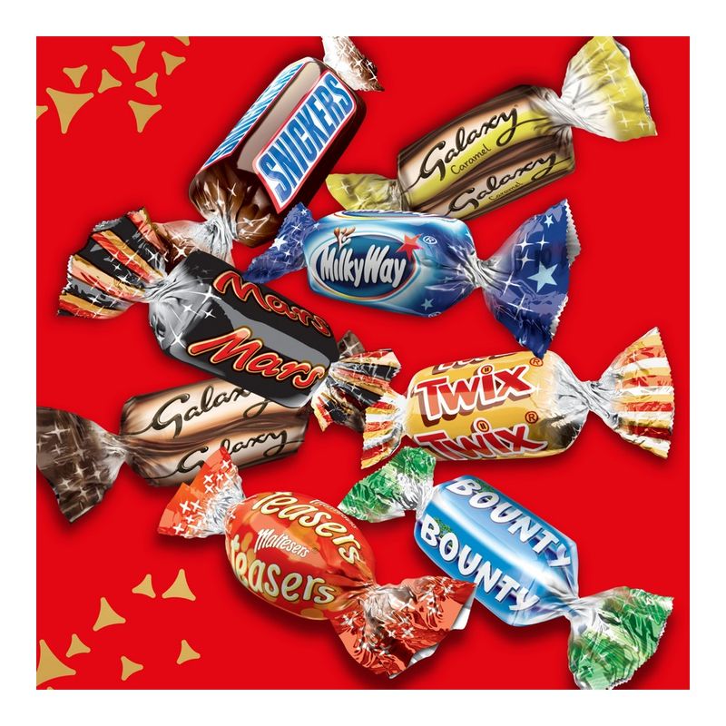 Deschide cutia de ciocolata pentru a gasi un sortiment de mini bomboane preferate: Snickers, Mars, Twix, Bounty, Galaxy, Maltesers Teasers, MilkyWay, si Galaxy Caramel.
