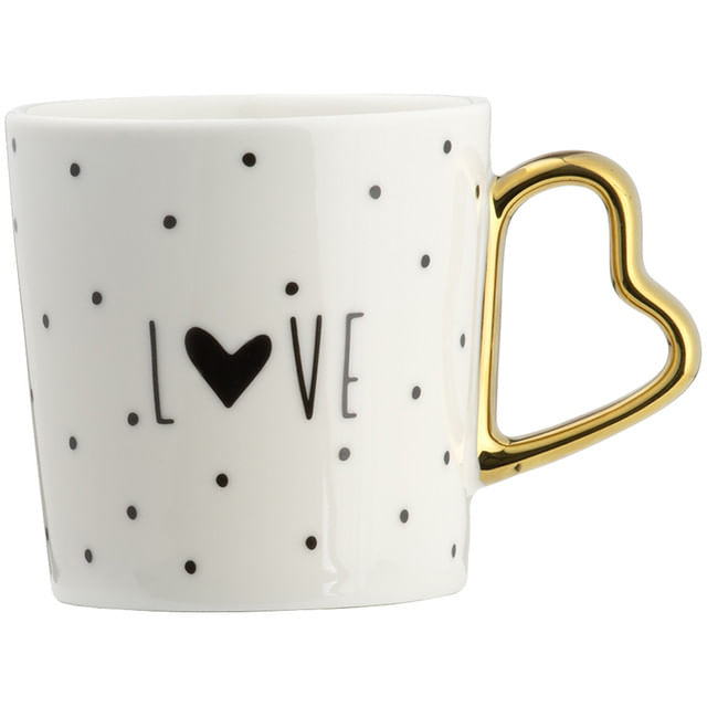 AMORE este o colectie de cani de portelan cu un maner in forma de inima atragator si grafica moderna. Grafica este de culoare neagra cu o inscriptie si un motiv de puncte, dungi si inimioare si manerul de culoare aurie. Canile vor fi un cadou grozav pentru diverse ocazii. Sunt usor de curatat, nu pot fi spalate in masina de spalat vase si nu pot fi folosite in cuptorul cu microunde.