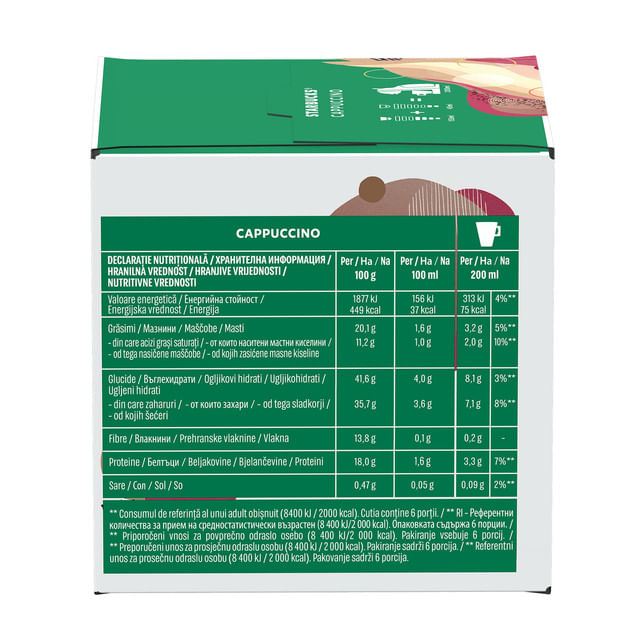 Cappucino capsule Starbucks Dolce Gusto, 6 capsule x 6 lapte. Informatii alergeni: Soia
