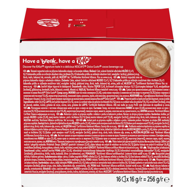 Transforma-ti pauza dulce intr-o experienta unica cu KitKat Ciocolata Calda. Inspirata de celebrul baton KitKat, aceasta ciocolata calda iti ofera o bautura cremoasa, cu note inconfundabile de napolitana. Compatibile cu sistemul Nescafé Dolce Gusto®, capsulele sunt solutia ideala pentru a-ti pregati rapid si simplu o ceasca delicioasa.