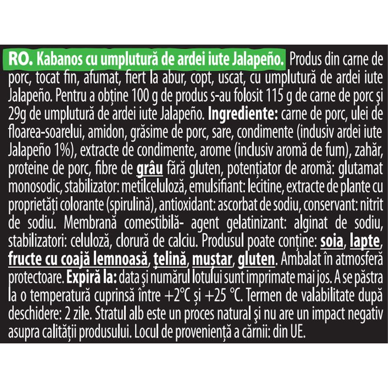 Produs din carne de porc, tocat fin, afumat, fiert la abur, copt, uscat, cu umplutură de ardei iute Jalapeño. Pentru a obține 100 g de produs s-au folosit 115 g de carne de porc și 29 g de umplutură de ardei iute Jalapeño.