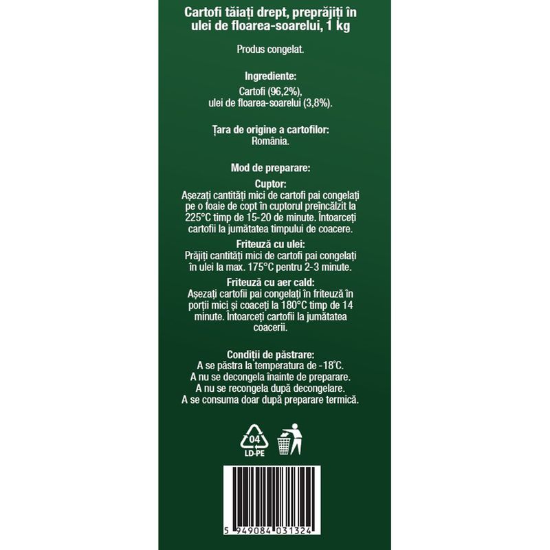 Cuptor: Asezati cantitati mici de cartofi pai congelati pe o foaie de copt in cuptorul preincalzit la 225°C timp de 15-20 de minute. Intoarceti cartofii la jumatatea timpului de coacere.