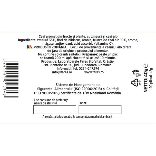 Ceai cu zmeura si ceai alb Fares Crangul Tainic, 20 plicuri Ceai cu zmeura si ceai alb Fares Crangul Tainic, 20 plicuri