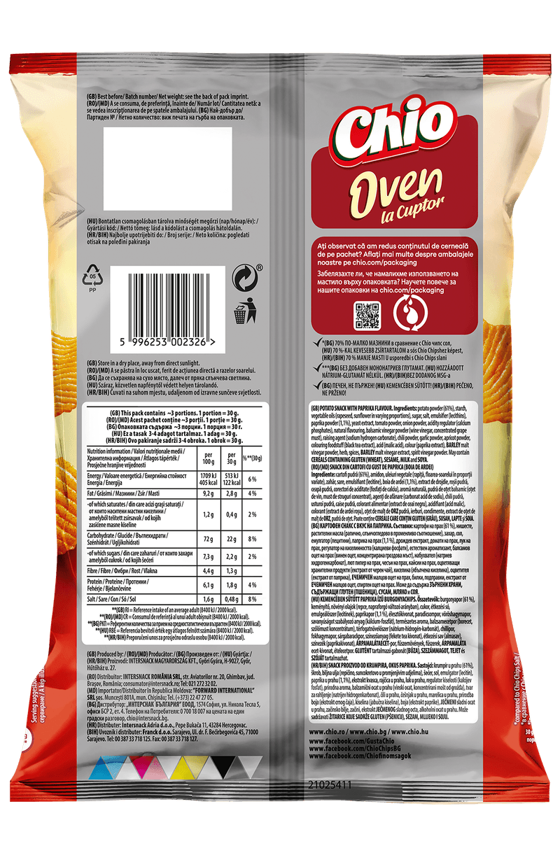 BacanieAlimente sarateChipsuriChipsuri rumenite la cuptor cu gust de paprika Chio Oven, 100 g