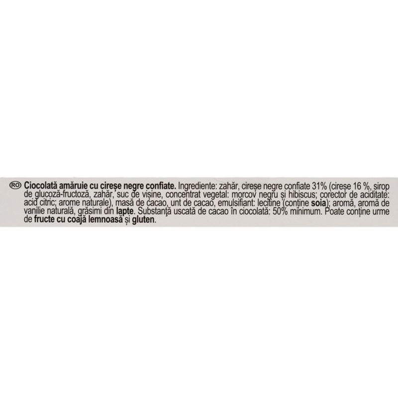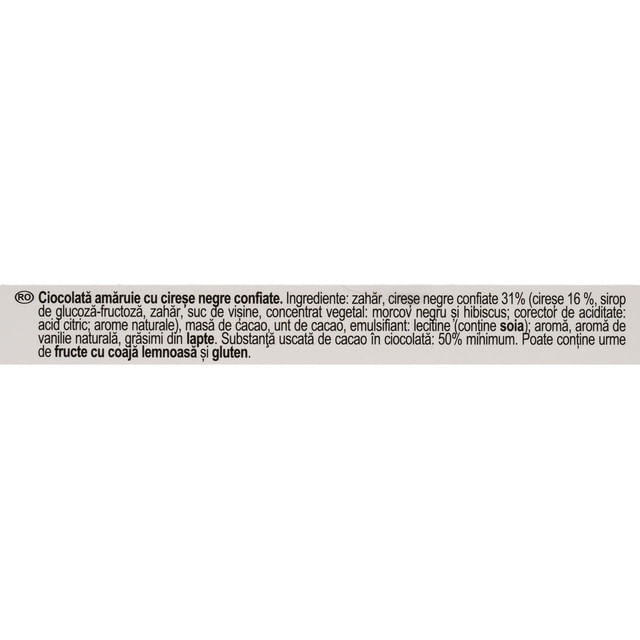 Zahar, cirese negre confiate 31% (cirese 16 %, sirop de glucoza-fructoza, zahar, suc de visine, concentrat vegetal: morcov negru si hibiscus; corector de aciditate: acid citric; arome naturale), masa de cacao, unt de cacao, emulsifiant: lecitine (contine soia); aroma, aroma de vanilie naturala, grasimi din lapte. Substanta uscata de cacao in ciocolata: 50% minimum.