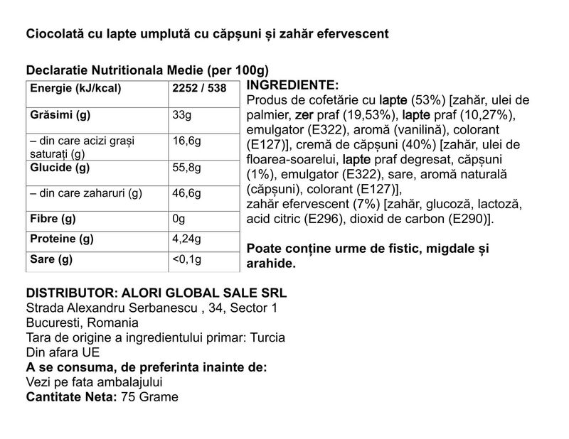 Produs de cofetarie cu lapte (53%) [zahar, ulei de palmier, zer praf (19.53%), lapte praf (10.27%), emulgator (E22) aroma (vanilina), colorant (E127)], crema de capsuni (40%) [zahar, ulei de floarea soarelui, lapte praf degresat, capsuni (1%), emulgator (E322), sare, aroma naturala (capsuni), colorant (E127)], zahar efervescent (7%) [zahar, glucoza, lactoza, acid citric (E296), dioxid de carbon (E290)].