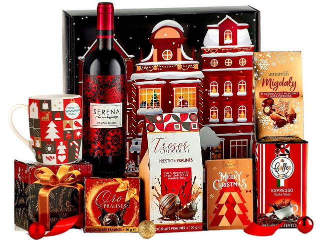 Cos pentru cadou Christmas Taste, vin rosu, cafea, cana, dulciuri si lumanari parfumate - Comanda online acum