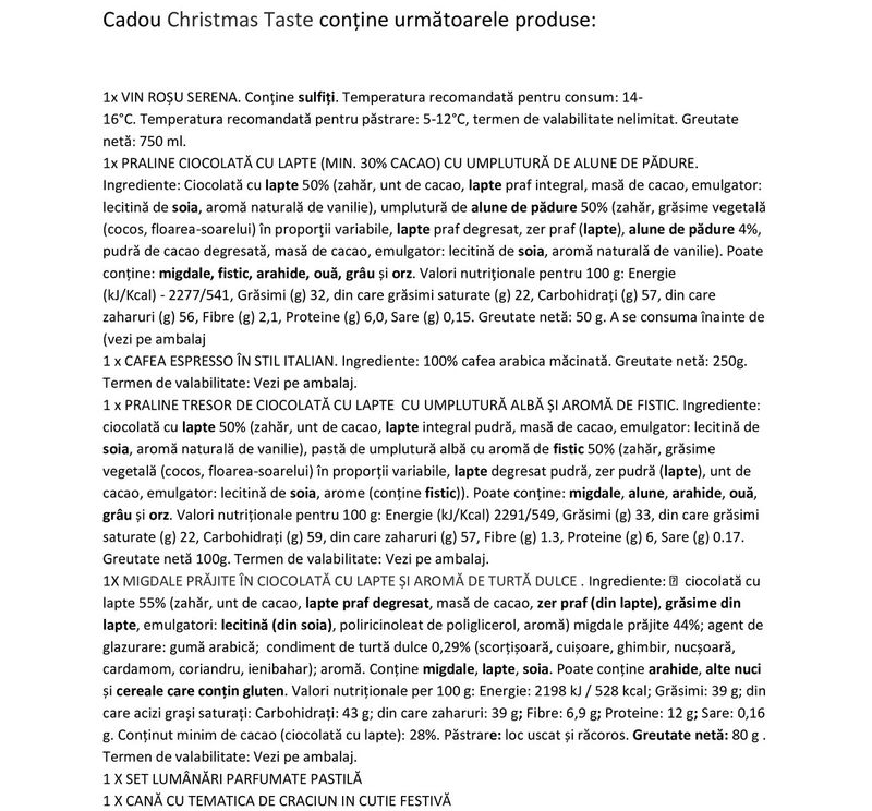 "Daruieste Cadoul Christmas Taste persoanelor dragi si ii vei rasfata cu gusturi si arome desavarsite! Totul incepe cu vinul rosu Serena, care deschide calea catre o selectie rafinata de praline, migdale in ciocolata si bomboane delicioase, continua cu o cafea in stil sicilian, si nu lasa deoparte nici accesoriile festive. Lumanarile parfumate creeaza la randul lor o atmosfera calda si intima de sarbatori, transformand fiecare clipa intr-o experienta de neuitat alaturi de restul surprizelor!