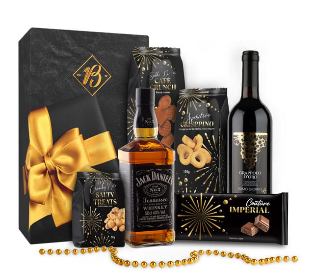 Cos pentru cadou Jack Gift, whisky Jack Daniel's, vin rosu Grappolo D'oro, si dulciuri - Comanda online acum