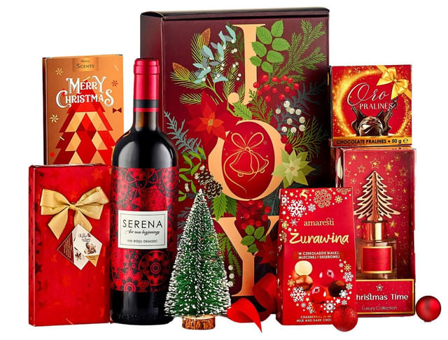 Cos pentru cadou Joy Season, vin rosu, difuzor de camera, lumanari parfumate si dulciuri - Comanda online acum