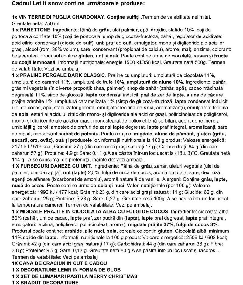 Ca o scena desprinsa dintr-o carte ilustrata, Cadoul Let It Snow aduce atmosfera magica a unui taram inghetat de Craciun, unde aromele delicioase si detaliile fine spun cea mai frumoasa poveste! Vinul rosu Terre Di Puglia Chardonnay IGP este deja in ton cu sarbatoarea, iar atunci cand este insotit de praline, migdale invelite in ciocolata, panettone pufos si fursecuri daneze, tabloul rasfatului e complet. De sarbatori, alege sa le daruiesti celor dragi un cadou care surprinde si incanta!