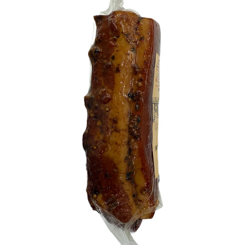 Piept de porc cu os, sare, condimente (ardei rosu maruntit ,usturoi, MUSTAR boabe, coriandru, piper rosu boabe, patrunjel, ienibahar boabe, foi dafin, piper alb boabe, piper negru si verde boabe, boia dulce, boia iute, cimbru macinat), antioxidant (ascorbat de sodiu, acid citric, citrat de sodiu, acetat de sodiu, acid ascorbic), zaharuri, proteine din ZER (contine LACTOZA), stabilizatori (trifosfat de sodiu), conservant (nitrit de sodiu)