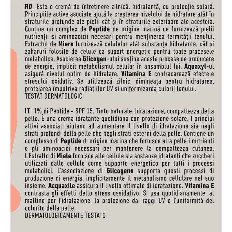 Este o crema de intretinere zilnica, hidratanta, cu protectie solara. Principiile active asociate ajuta la cresterea nivelului de hidratare atat in straturile profunde ale pielii cat si in straturile exterioare ale acesteia. Contine un complex de Peptide de origine marina ce furnizeaza pielii nutrientii si aminoacizii necesari pentru mentinerea fermitatii tenului. Extractul de Miere furnizeaza celulelor atat substante hidratante, cat si zaharuri folosite de celule ca suport energetic pentru toate procesele metabolice. Asocierea Glicogen-ului sustine aceste procese de producere de energie, implicit metabolismul celular in ansamblul lui. Aquaxyl-ul asigura nivelul optim de hidratare.