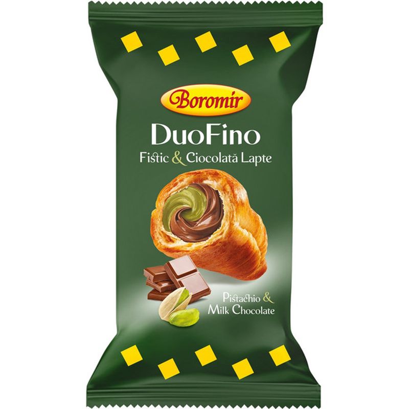 Faina alba de grau, crema cu fistic 17% (sirop de glucoza, apa, zahar, ulei vegetal de palmier, pasta de fistic 5%, lapte praf integral, amidon modificat, coloranti: carbonat de calciu, complecsi de cupru ai clorofilelor si clorofilinelor, sare iodata, agent de ingrosare: pectina, emulsifianti: mono si digliceride ale acizilor grasi, conservant: sorbat de potasiu, arome), crema cu ciocolata lapte 17% [sirop de glucoza, apa, ciocolata cu lapte 16% (lapte praf integral 31%, lapte praf degresat 31%, cacao pudra degresata, unt de cacao, zahar), zahar, ulei vegetal de palmier, colorant: carbonat de calciu, agent de ingrosare: pectina, conservant: sorbat de potasiu, arome], uleiuri vegetale (palmier, floarea-soarelui, rapita), maia/drojdie naturala 12% (faina de grau, apa), oua, zahar, sirop de glucoza, apa, emulsifianti: mono si digliceride ale acizilor grasi, esteri poliglicerici ai acizilor grasi si lecitina de soia, lapte praf integral, miere, unt, drojdie, sare iodata, faina din malt de grau, arome, acidifiant: acid citric. Contine zahar adaugat