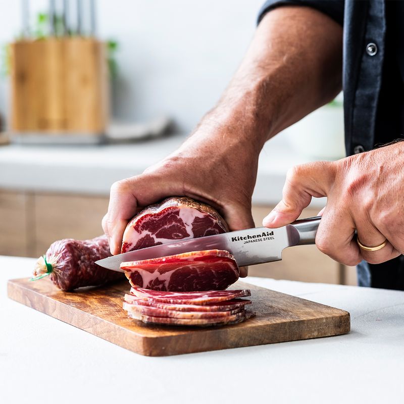 Cutitul pentru carne KitchenAid este conceput pentru taierea rapida si uniforma a carnii crude sau gatite, oferind precizie si un control sporit.