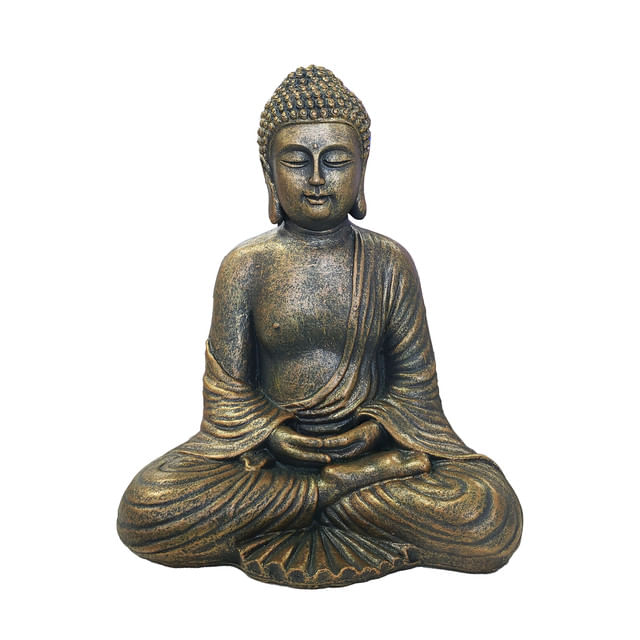 Decoratiune Buddha sezand din rasina, potrivita pentru decor interior sau exterior protejat. Dimensiuni aprox. 24 × 17 × 29 cm.