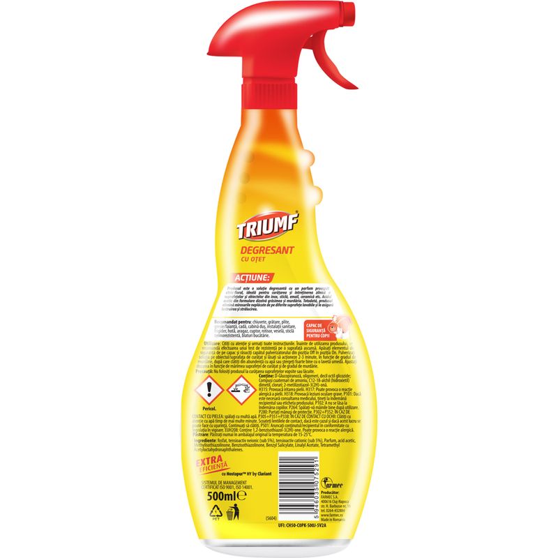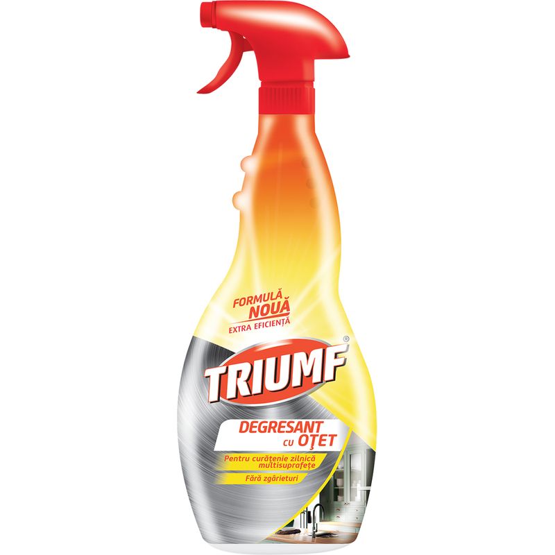 Triumf Degresant cu Otet si Hostapur™ HY by Clariant este solutia ideala pentru curatenia zilnica in bucatarii si bai, actionand eficient asupra grasimii, murdariei si mirosurilor neplacute. Cu o formula prietenoasa cu mediul, fara abrazivi, produsul curata in profunzime fara sa zgarie suprafetele.