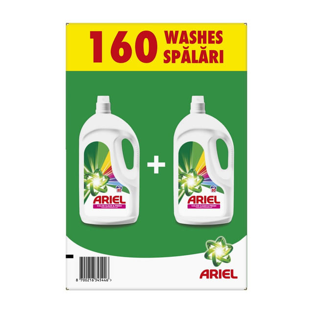 Detergentul lichid Ariel ofera stralucire hainelor albe si impiedica aparitia petelor de transpiratie. In plus, detergentul lichid Ariel contine enzime de origine naturala si este disponibil intr-un ambalaj reciclabil. Pentru pete foarte dificile, foloseste detergentul lichid Ariel pentru a pretrata cu ajutorul capacului, apoi pune hainele in masina de spalat. Pentru rezultate optime, introduceti capacul de dozare ce contine detergentul de rufe in cuva masinii de spalat.