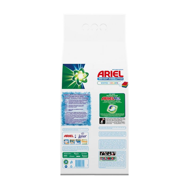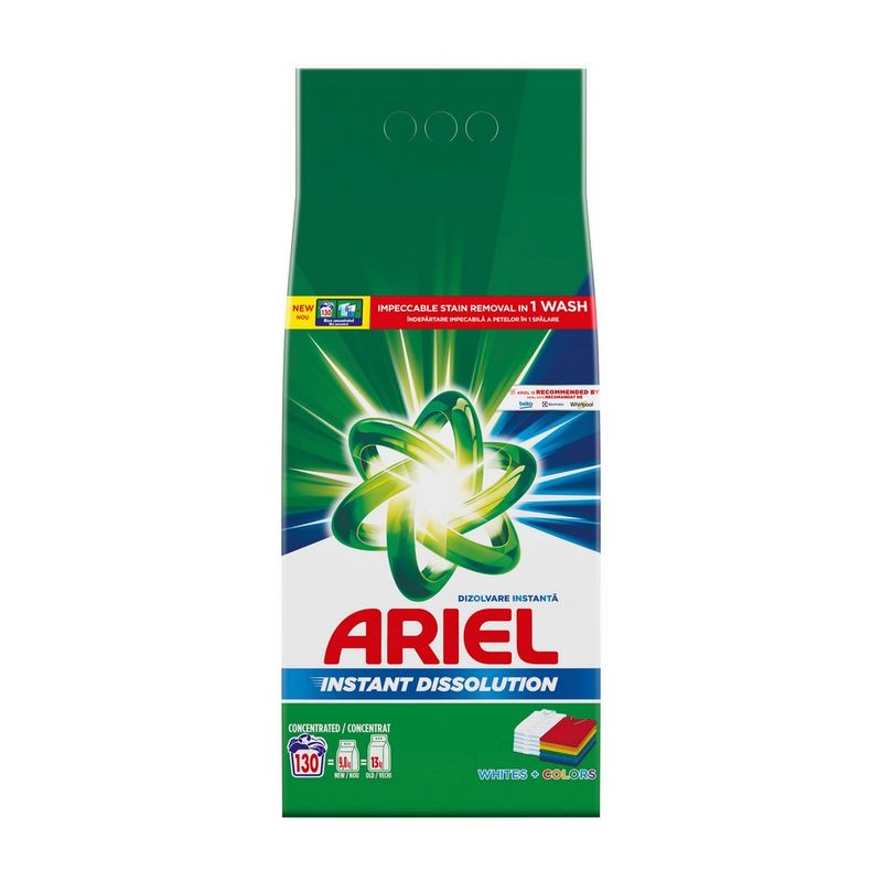 Ariel, marca recomandata de Beko Electrolux Whirlpool, prezinta Whites+Colors detergentul pudra de rufe cu dizolvare imediata. Acum, cu formula sa concentrata, detergentul pudra Ariel asigura o putere mai mare si spala mai multe rufe per gram pentru indepartarea impecabila a petelor printr-o singura spalare. Datorita tehnologiei unice de dizolvare imediata, se dizolva rapid in contact cu apa, se activeaza instantaneu si patrunde adanc in fibre, chiar si in ciclurile reci. Reduceti temperatura de spalare la 30°C si economisiti pana la 60% din energie. (Consumul de energie al masinii de spalat, de la 60°C la 30°C, ciclu normal). Ciclurile reci de spalare ajuta la protejarea materialelor pentru o perioada mai lunga de timp, comparativ cu ciclurile de spalare cu apa calda. In plus, formula sa contine enzime de origine naturala. Detergentul pudra Ariel Whites+Colors are si un ambalaj reciclabil .