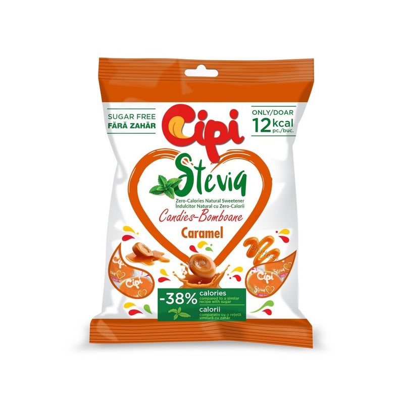 Dropsuri cu caramel Cipi Stevia, 80 g. Contine lecitina de soia, poate contine urme de lapte.