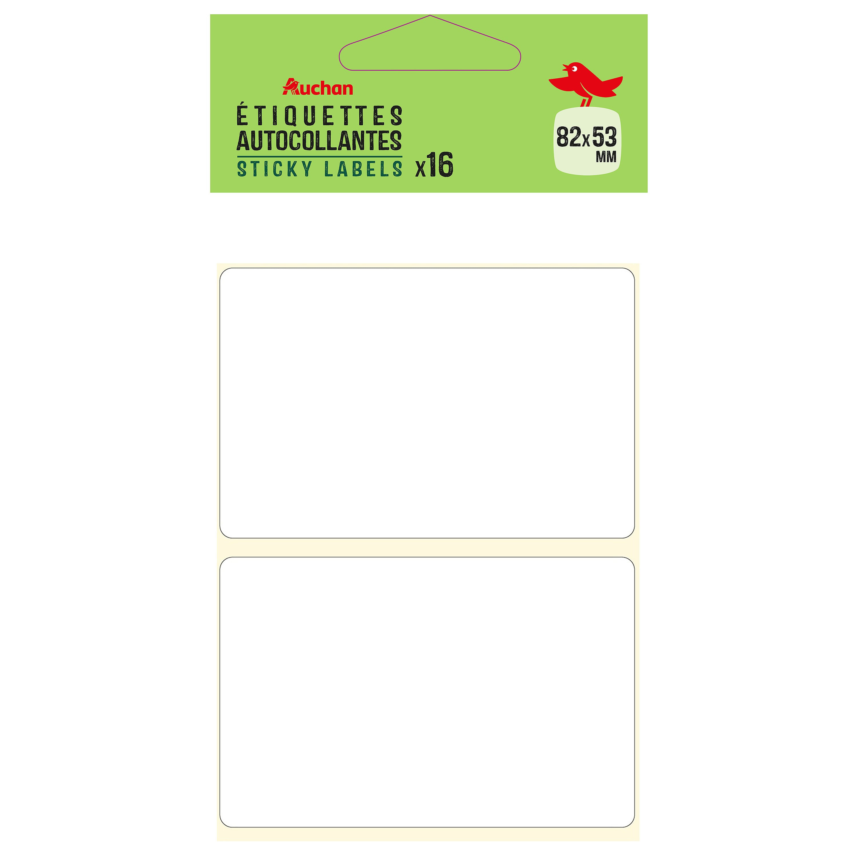 Etichete Auchan, 16 bucati, cu dimensiunile de 82 x 53 mm. Se recomanda utilizarea acestora de catre persoane cu varsta minima de 3 ani.