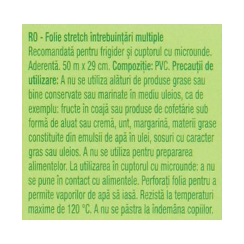 Folie alimentara Auchan, 2 in 1. Folia protejeaza impotriva bacteriilor, prafului sau altor elemente care ar putea contamina alimentele dar are si un rol de protectie impotriva transferului de mirosuri. Aceasta folie poate fi utilizata in siguranta si in cuptorul cu microunde.