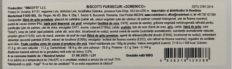 Faina de grau premium; glazura de cofetarie (zahar alb, uleiuri vegetale (ulei din samburi de palmier complet hidrogenat, ulei de floarea soarelui), pudra de cacao (minim 9%), lapte praf degresat, zer praf, emulgatori (lecitina de soia, E476), aroma de vanilie); grasime vegetala nehidrogenata rafinata pentru panificatie (ulei de palmier, ulei de shea, emulgator E471, arome, colorant E160a); zahar; arahide; bile de orez (faina de orez, gris, zahar, faina de grau, sare "Extra"); sirop de zahar (apa potabila, zahar alb, acid citric, bicarbonat de sodiu); aroma crema de vanilie (substante aromatizante, substante aromatizante naturale, propilen glicol E1520); sare de masa; amestec de praf de copt (faina de grau premium, agenti de afanare(difosfat disodic (E450i), bicarbonat de sodiu)); antioxidant alimentar (ascorbil palmitat (E304), extract de tocoferol(E306)); emulgator: lecitina din floarea soarelui (E322), ulei rafinat de floarea soarelui); regulator de aciditate: acid citric. Poate contine urme de susan si produse din oua.