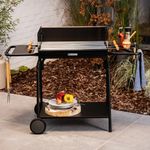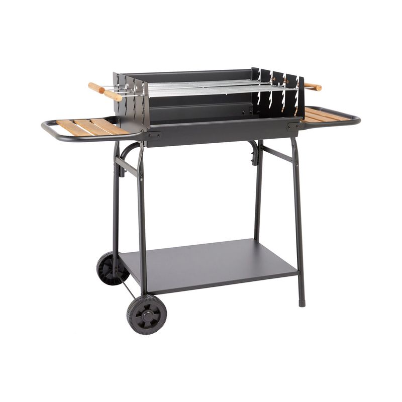 Grătarul combină un design spațios și funcțional cu confortul unui cărucior mobil și rafturi laterale metalice practice.
