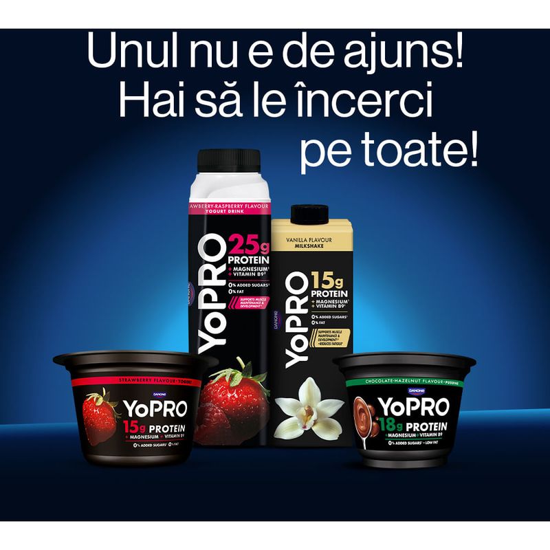 Cu magneziu, vitamina B9, si 15g de proteine complete* care iti sustin masa musculara**, YoPro iti incurajeaza stilul de viata activ, fara sa uite ca micul dejun este cea mai importana masa a zilei, si meriti sa fie delicioasa. Fara zaharuri adaugate*** si continut minim de grasimi, YoPro este aici sa iti sustina progresul zi de zi.