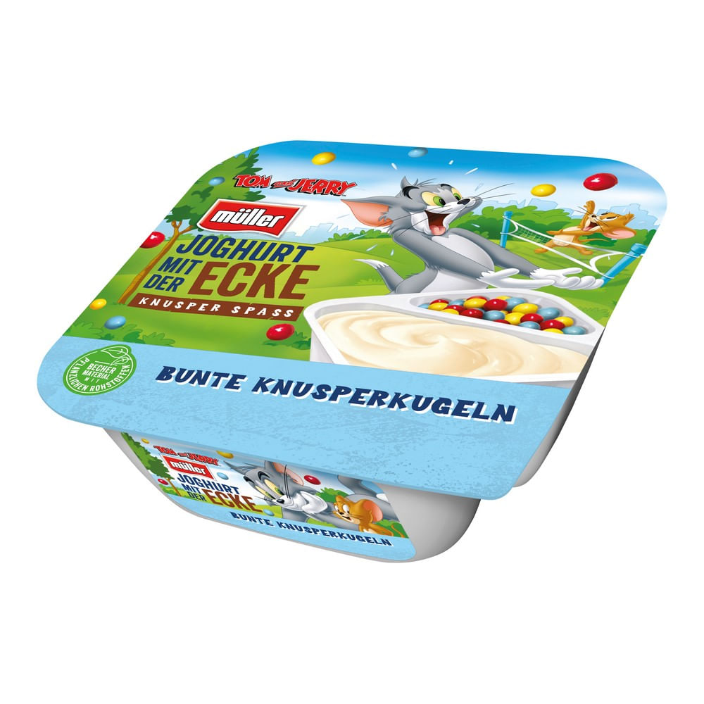 Iaurt (lapte integral pasteurizat, fermenti specifici de iaurt (contin lapte), bilute colorate din cereale glazurate cu ciocolata alba (zahar, unt de cacao, faina de grau, lapte praf integral, faina de grau integral, faina de malt de grau, emulgator lecitina de soia, coloranti vegetali (concentrat de ridiche, coacaze negre, mere, spirulina, sofranel si lamaie), sare alimentara, extract de malt de orz, agent de crestere carbonat de sodiu, corector de aciditate difosfat, aroma), apa, zahar, amidon modificat, agent de ingrosare pectine, corector de aciditate citrat de sodiu, acidifiant acid citric, colorant caroteni, extract din pastai de vanilie, aroma. Poate contine urme de oua, arahide si fructe cu coaja lemnoasa. Continut de grasime in produs finit : 4,9 %. Nivelul de umplere rescpecta normele tehnice.