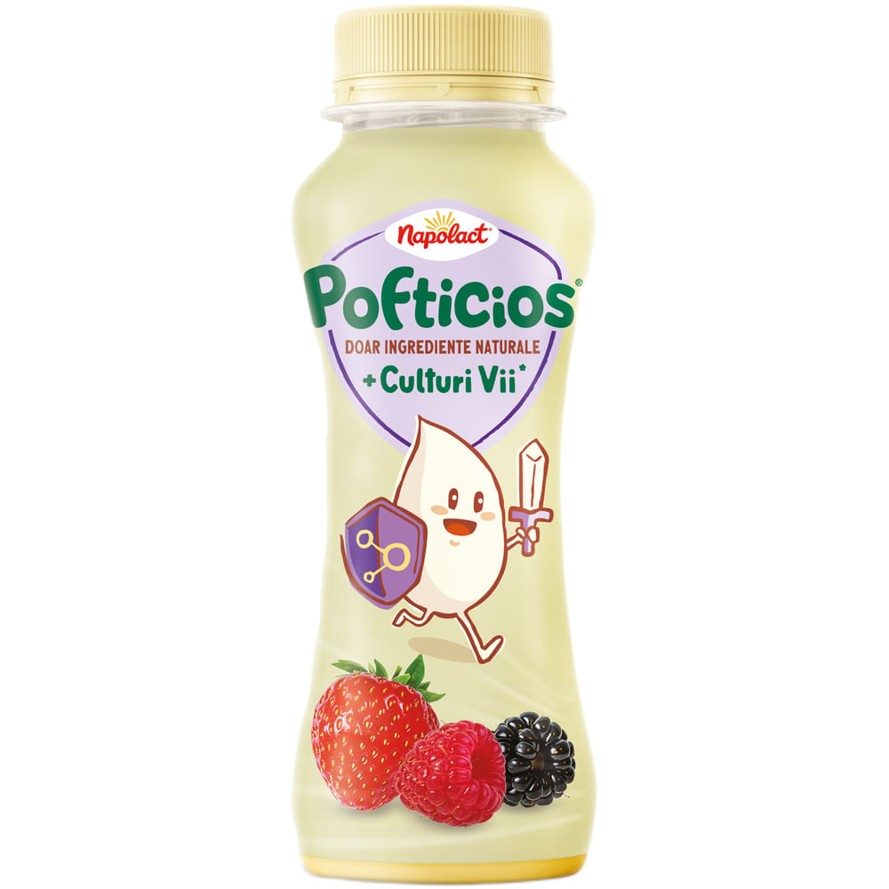 Iaurtul de baut Napolact Pofticios contine doar ingrediente naturale si culturi vii, care mentin burtica fericita. O bunatate de iaurt de baut consistent si cremos, cu reteta curata, facut cu lapte din Romania si imbinat armonios cu preparat de fructe delicioase de padure (capsuni, mure, coacaze, zmeura).