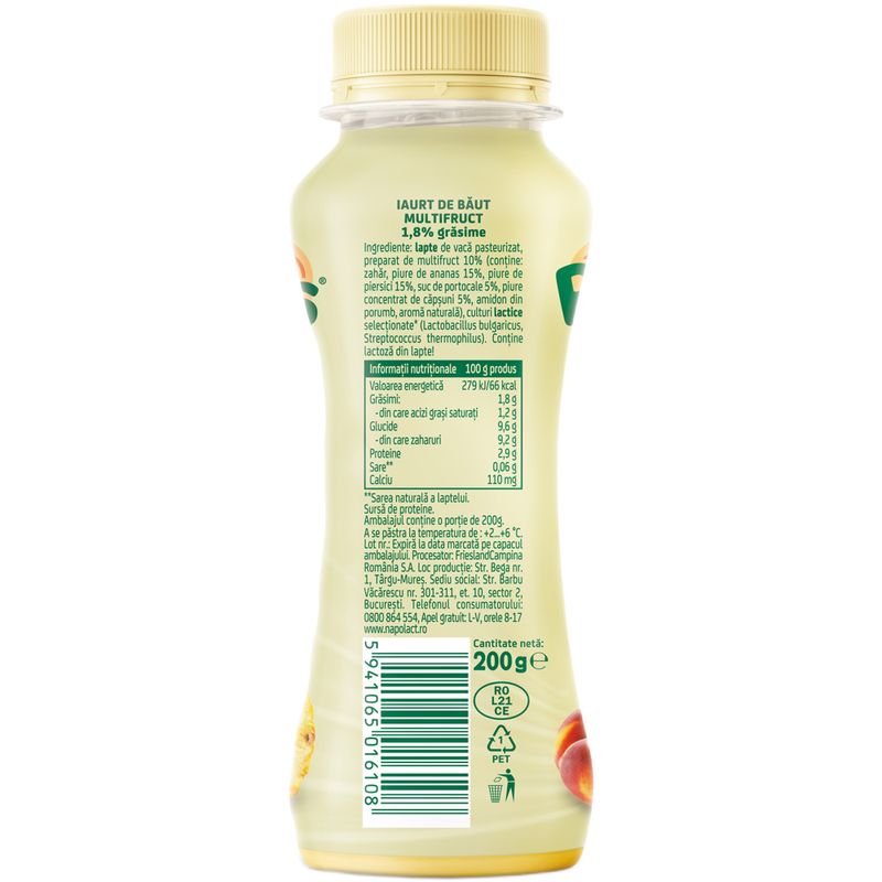 Iaurtul de baut Napolact Pofticios contine doar ingrediente naturale si culturi vii, care mentin burtica fericita. O bunatate de iaurt de baut consistent si cremos, cu reteta curata, facut cu lapte din Romania si imbinat armonios cu preparat de fructe delicioase (ananas, piersici, portocale, capsuni)