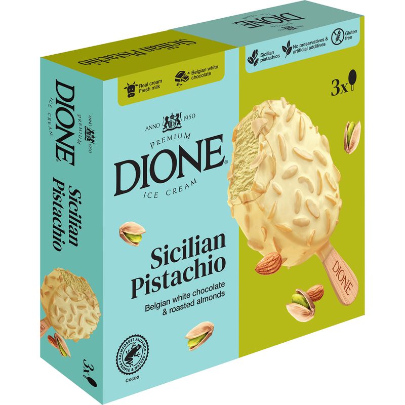 Inghetata pe bat de fistic cu ciocolata alba belgiana si migdale Dione, 3 x 90 ml - Comanda online acum