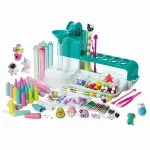 Setul contine baza din plastic si accesorii pentru depozitarea elementelor si a creioanelor pe care le creati, palnie si instrumente, protectii antiderapante, 10x recipiente, dopuri, capace, 12x cartuse de cerneala in diferite culori, sclipici, margele,10 figurine din cauciuc, manual de intructiuni.