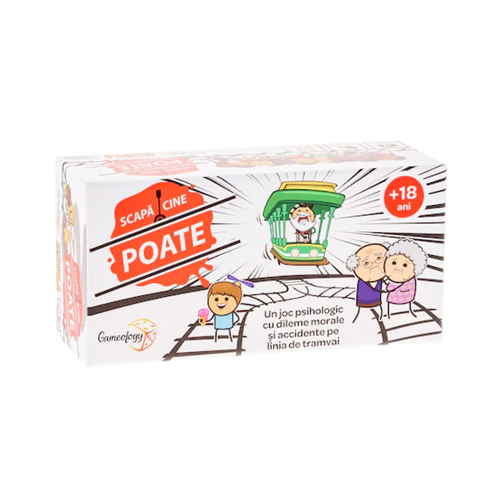Afla mai multe despre dilemele morale si accidentele tramvaiului din Scapa cine poate. Jocul are la baza Dilema Tramvaiului din anul 1967, o problema de natura psihologica. In Scapa cine poate, un participant are rol de Conductor si el este cel care decide pe ce traiectorie va trimite tramvaiul nemilos. In calea sa, va nimici orice obstacol si cu siguranta nu va rata nimic. Restul jucatorilor urmeaza sa se imparta in 2 echipe si au ca scop induplecarea Conductorului. Fiecare echipa isi pledeaza cazul si incearca sa il convinga pe acesta sa nu trimita tramvaiul nemilos pe directia lor. Cei care il conving vor ramane nevatamati. Fiecare runda va avea un alt Conductor, iar fiecare dintre jucatori vor face cu randul si vor avea aceeasi misiune. Ceilati participanti vor trebui sa aseze cartonase Modificator si noi personaje pe sinele de tramvai, pentru a incerca sa il convinga pe Conductor sa nu ii omoare pe ei, ci pe ceilalti. Jocul incepe prin plasarea tablei de joc ce contine liniile de tramvai in mijlocul mesei. Mai apoi, cartonasele trebuiesc asezate pe trei categorii: Inocent, Vinovat si Modificatori.