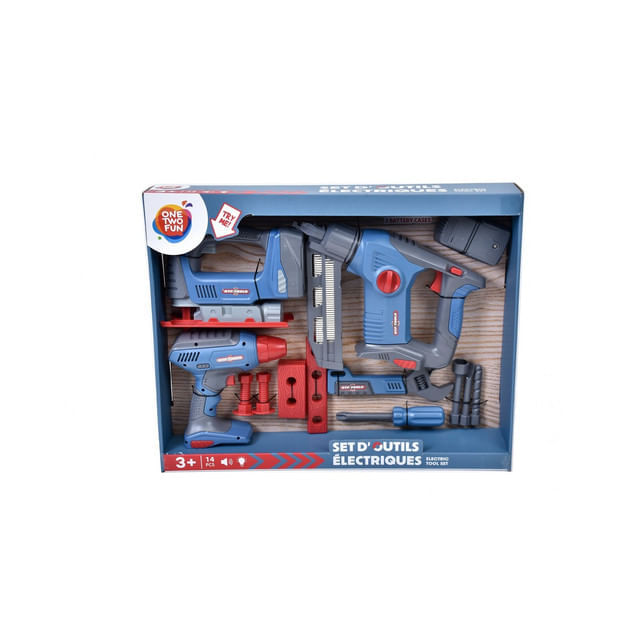 One Two Fun - Set unelte electrice de jucarie; Varsta recomandata: 3+; Total 14 piese: 1 pistol cu cuie, 1 burghiu, 1 fierăstrău pendular, 1 baterie suplimentară; 1 cheie, 1 șurubelniță, 3 șuruburi; 2 piulițe; 3 lemne; Dimensiune produs: pistol cu cuie: 25.5 x 6 x 19.5 cm, burghiu: 22.5 x 5 x 17 cm, fierastrau pendular: 18.7 x 5.7 x 14 cm; Funcție: electric cu lumină; Baterie: 3 x AAA nu sunt incluse