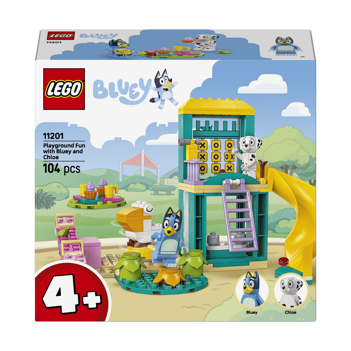 Distractie la locul de joaca cu Blue si Chloe (11201) este o jucarie pentru prescolarii care indragesc serialul TV Blue. Este conceputa pentru a oferi nelimitate posibilitati de joaca creativa, prin intermediul careia copiii de 4 ani si mai mari isi dezvolta increderea si abilitatile de rezolvare a problemelor. Aceasta jucarie adaptabila pentru prescolari include minifigurinele Blue si Chloe reprezentand popularii catelusi din serialul TV. Cele doua personaje se afla intr-un loc de joaca viu colorat, echipat cu balansoar, tobogan, scara de catarat si un pelican care se roteste. Locul de joaca include si 3 plante printre care personajele pot sari, un turn cu telescop si o zona de picnic cu bauturi si prajituri. In cutie se afla pungi separate, fiecare continand 1 model construibil, plus o caramida mare pentru incepatori si instructiuni simple pentru a face constructia rapida si distractiva pentru micii constructori. Instructiunile intuitive sunt oferite intr-o brosura colorata. Seturile LEGO pentru copii de 4 ani si mai mari sunt modul perfect prin care adultii se distreaza construind alaturi de micuti.