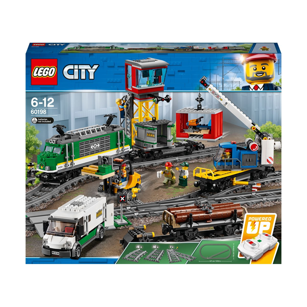 Pregateste Trenul marfar 60198 LEGO® City pentru a incepe transportul! Foloseste stivuitorul pentru a incarca containerele, inainte de a le urca in vagon cu macaraua. Cupleaza toate vagoanele in spatele locomotivei, urca in cabina, sufla in fluier si porneste la drum! Livreaza incarcatura la timp si asigura-te ca toate merg struna in LEGO City!
